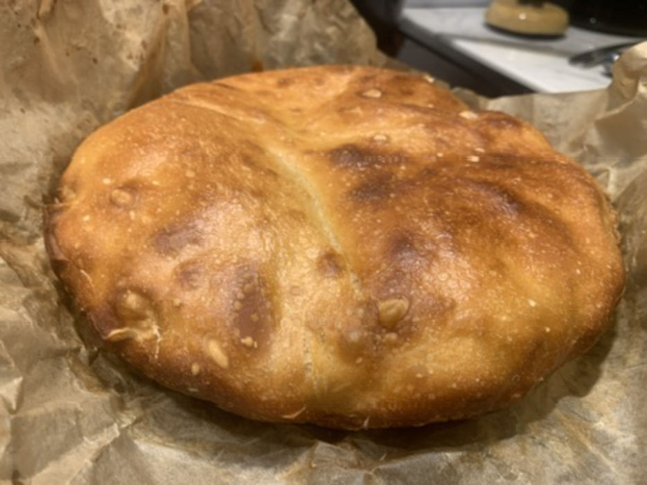 Pan redondo de masa madre pura con corte en cruz y corteza dorada y crujiente.